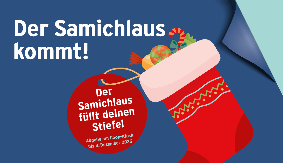 Am Samstag, 6. Dezember 2025, von 11–16 Uhr, darf jedes Kind beim Samichlaus mit dem Abholschein seinen Stiefel abholen – prall gefüllt mit Leckereien!